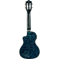 This Lanikai Quilted Maple cutaway electric concert ukulele in trans blue provides a wider nut for player comfort, select figured wood, Grover open back tuners on a slotted headstock, multi-ply black ABS body binding, NuBone XB nut and saddle, D'Addario strings, Fishman Kula preamp and tuner, glossy finish and a foam case.