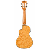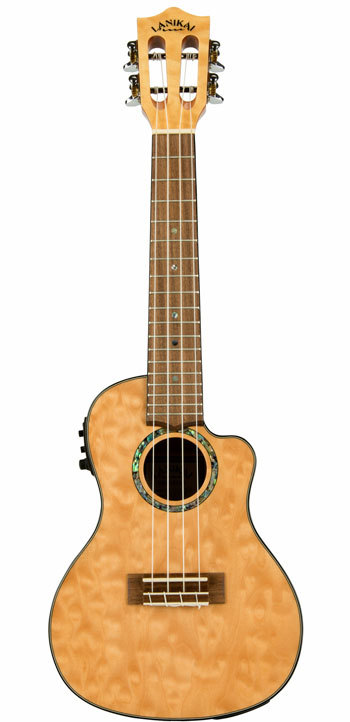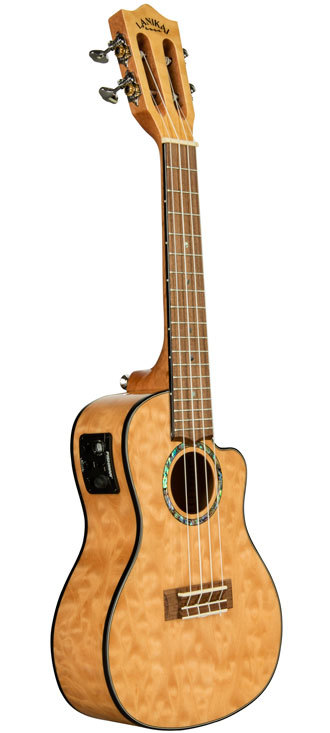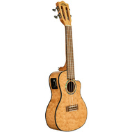 The Quilted Maple ukulele by Lanikai delivers dynamic new features such as a wider nut for player comfort, select figured wood, Grover open back tuners, multi-ply black ABS body binding, NuBone XB nut and saddle, D'Addario strings, cutaway electric with Fishman Kula preamp and tuner, glossy finish and a foam case.
