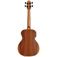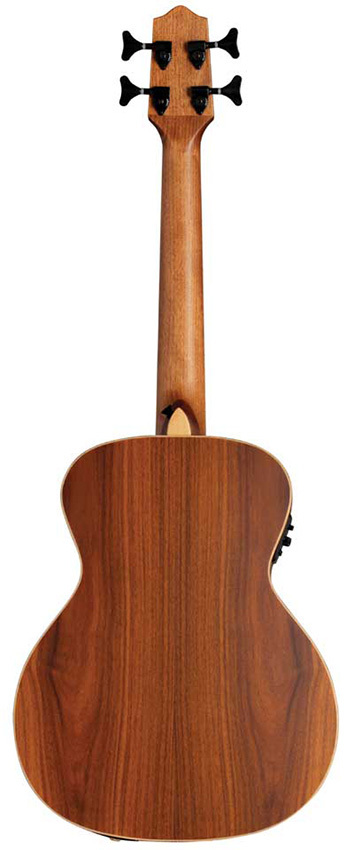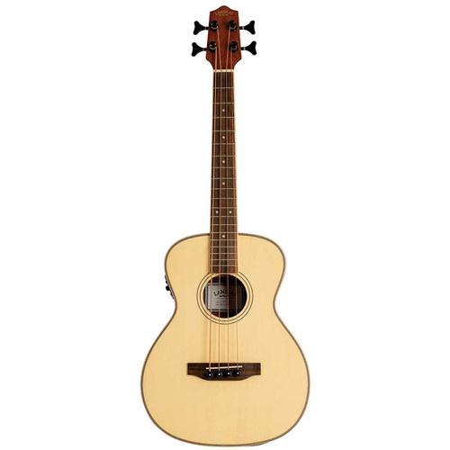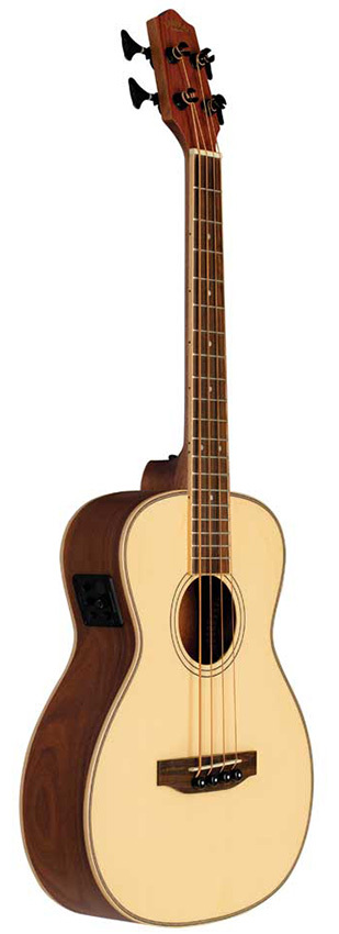 A Lanikai Solid Spruce Top with Morado Back and Sides Electric Bass with herringbone purfling ukulele has a 23.4" scale for a ukulele feel and utilizes many features such as a truss rod for easy action adjustments, Fishman Classica II pickup with tuner, a comfortable neck profile, select wood, smooth action black open back tuners, NuBone XB nut and saddle, D'Addario strings, satin finish and a Lanikai Deluxe 10mm padded gig bag.