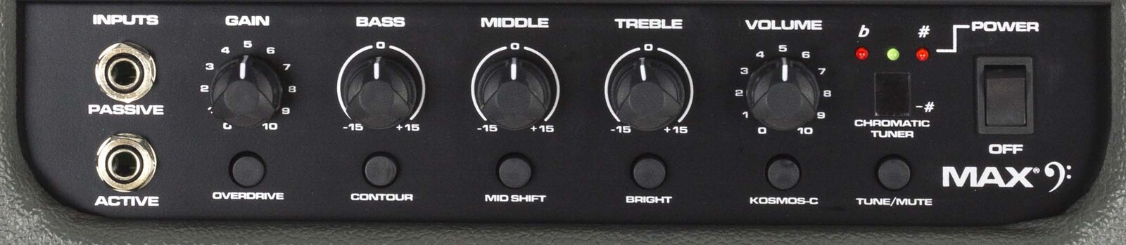 The MAX also features a built-in chromatic tuner with mute, a tuned and ported enclosure, 1/8" headphone output and 1/8" auxiliary input. The amp also includes an XLR direct output with ground lift.
