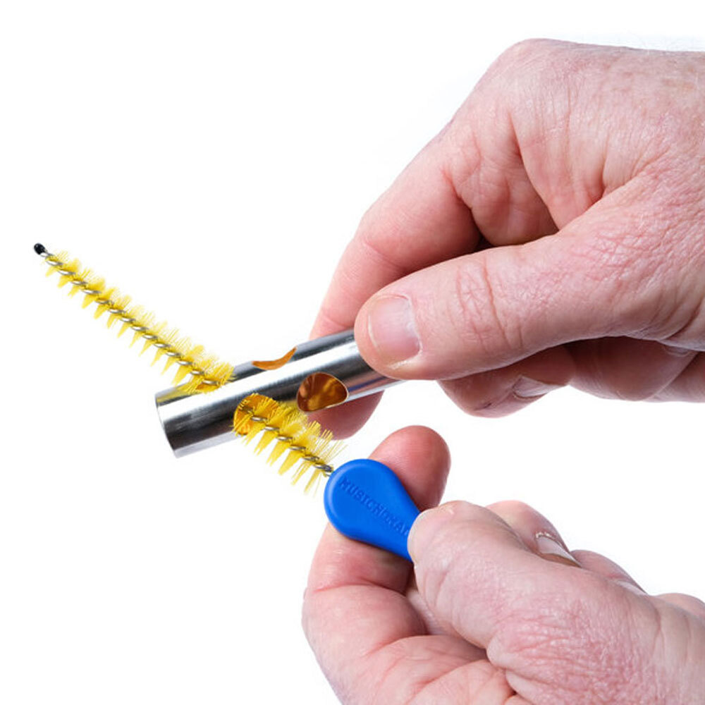 The extra long, skinny brush lets you clean the entire backbore & throat. Turn the brush around & use the short & wide bristles to clean the cup. We dialed in the perfect brush fiber stiffness to effectively clean but remain gentle on the finish. Protective bumpers on each end keep the metal from scratching your finish. You will really appreciate the ergonomic handle that makes cleaning a breeze, and it even comes in a convenient resealable, reusable, & recyclable storage bag.