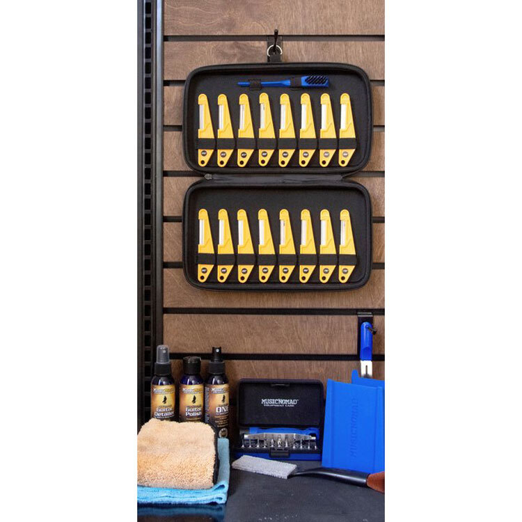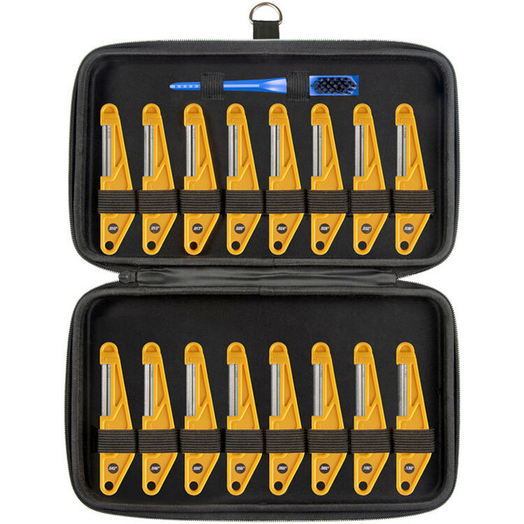 This custom set includes all 16 sizes starting with .010" up to .130" they work great for electric, acoustic & classical guitars & even 5 string basses. We even include an organizational storage case to hold all 16 files and a convenient cleaning brush.