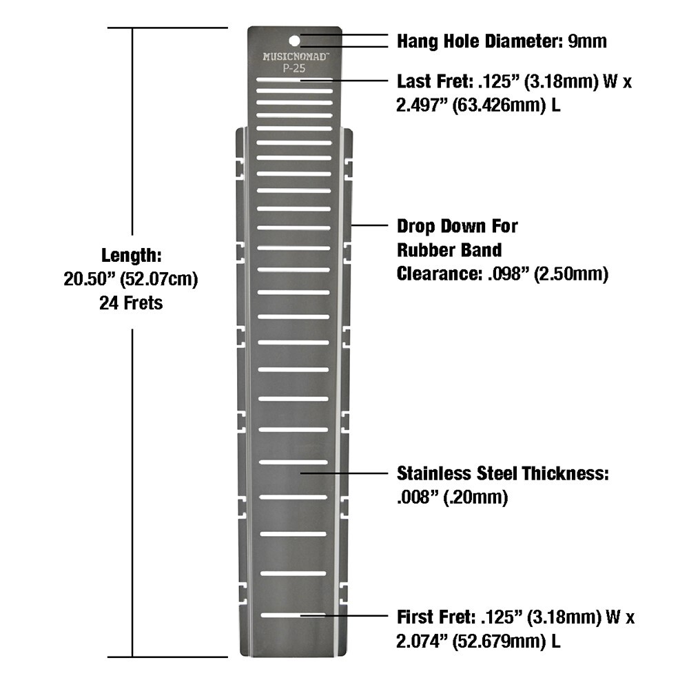 - Our high quality stainless steel is the perfect thickness at .008" (.20mm). We use a precision manufacturing process free of burrs and leaves all edges smooth and rounded, so it protects the fretboard without damaging it. The tapered design has slot sizes that measure from the first fret .125" (3.18mm) W x 2.074" (52.679mm) L to the last fret .125" (3.18mm) W x 2.497" (63.426mm) L and fits all fret sizes (from narrow to jumbo) found on 6 string guitars.