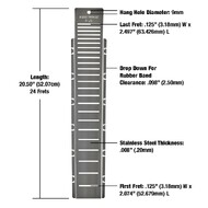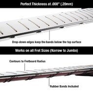 Our high quality stainless steel is the perfect thickness at .008" (.20mm), uses a precision manufacturing process free of burrs, and leaves all edges smooth and rounded. Our innovative formed drop-down edges allow the rubber bands we include to hold the Fret Shield in place securely and keep the bands below the top surface to avoid damaging them during the polishing process.