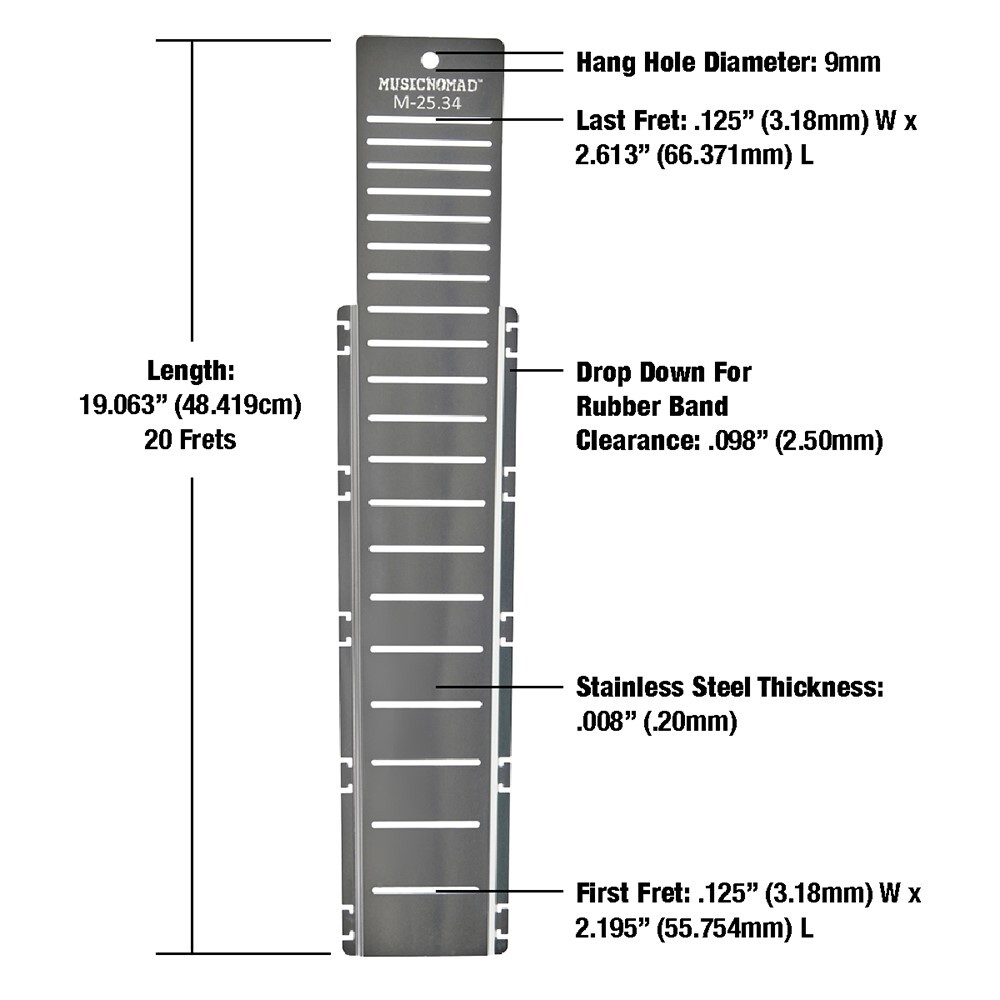 - Our high quality stainless steel is the perfect thickness at .008" (.20mm). We use a precision manufacturing process free of burrs and leaves all edges smooth and rounded, so it protects the fretboard without damaging it. The tapered design has slot sizes that measure from the first fret .125" (3.18mm) W x 2.195" (55.754mm) L to the last fret .125" (3.18mm) W x 2.613" (66.371mm) L and fits all fret sizes (from narrow to jumbo) found on 6 string guitars.