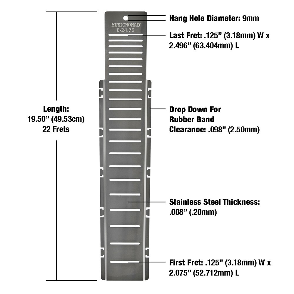 - Our high quality stainless steel is the perfect thickness at .008" (.20mm). We use a precision manufacturing process free of burrs and leaves all edges smooth and rounded, so it protects the fretboard without damaging it. The tapered design has slot sizes that measure from the first fret .125" (3.18mm) W x 2.075" (52.712mm) L to the last fret .125" (3.18mm) W x 2.496" (63.404mm) L and fits all fret sizes (from narrow to jumbo) found on 6 string guitars.