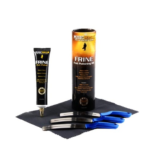 Music Nomad's FRINE Fret Polishing Kit contains everything you need to give your frets an eye glaring, clean shine. The specially formulated FRINE Fret Polish has micro-fine polishing compounds that safely & quickly remove oxidation, dirt & oil.