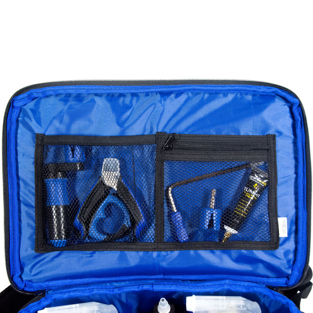 - Includes 15 sidewall storage compartments all easy to see, plus straps to store your work mat, guitar stand and cables, high quality external zippers, 1/2" padded construction to protect your gear, thick air mesh comfort shoulder and hand straps, and a moveable padded divider partition.
