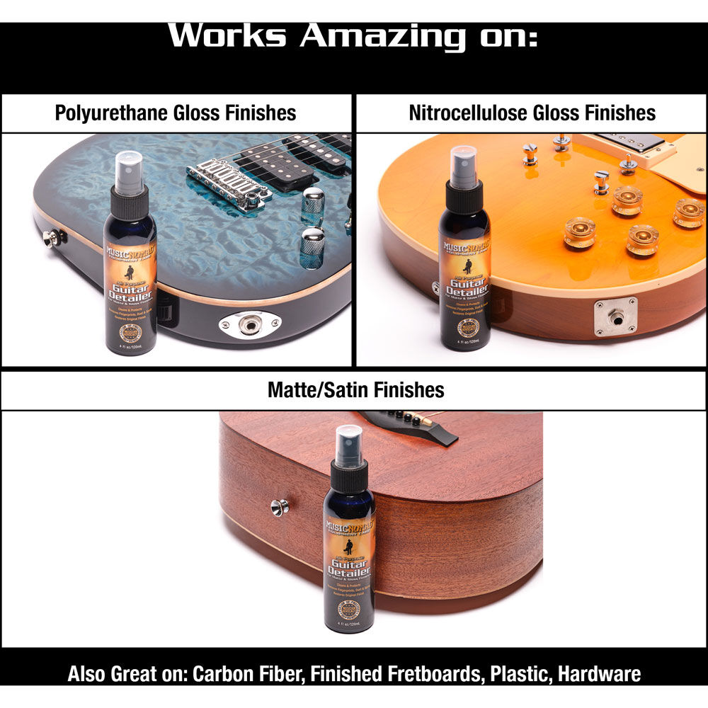 Because it is a straight cleaner with no polish or wax it does an amazing job on many finishes including Gloss, Matte and Satin Guitar Bodies and Necks, plus Metal Hardware and Plastic on the Guitar.