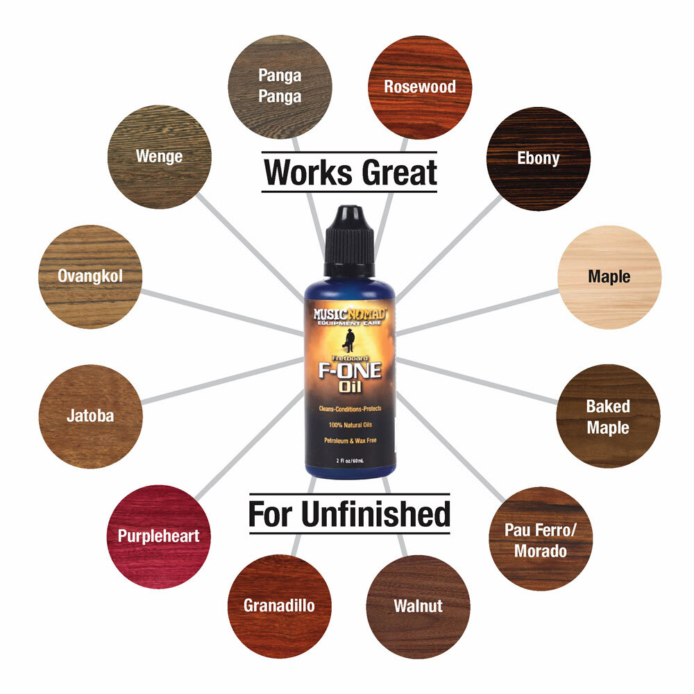 F-ONE gives wood its life back. F-ONE is formulated using a complex mixture of the finest ultra refined tree and seed oils to clean, condition & protect your fretboard/fingerboard.