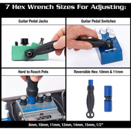 - Step up your game with our Pedal Hex Wrench & Screwdriver Set. Designed and engineered with the 7 most popular guitar pedal hex wrench sizes: 8mm, 10mm, 11mm, 12mm, 14mm, 15mm, 1/2" to adjust nuts on jacks, pots and switches on both vintage and modern pedals. The reversible blue hex wrench contains both the 10mm & 11mm sizes. The most popular guitar pedal screwdriver bit sizes include: Phillips (#1, #2), Flat-head 2.5mm & Allen Keys (1/16", 1.5mm, 2mm) for tiny knob set screws and any screws to open pedal parts. With all the Hex Wrench & Screwdriver sizes, it’s the perfect tool kit to help you when you are building or assembling your own pedals.