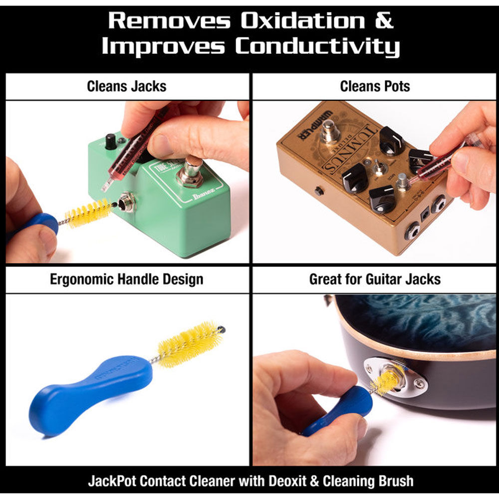 - Our JackPot Contact Cleaner with Deoxit® (2mL) is specially made for electronics, it removes oxidation, improves conductivity, stops scratchy and intermittent signals and prevents future damage. Works great for guitar pedal jacks, pots and footswitches, plus any music gear with electronics. Use our ergonomic and custom designed Jack & Pot Cleaning Brush with our Cleaner to safely clean inside the jacks and pots. Better than a contact cleaner alone, the brush gets into all the crevices and removes the oxidation safely without soaking the inside of the pedal. Small in size but big in results with 70 drops of contact cleaner solution in every tube.