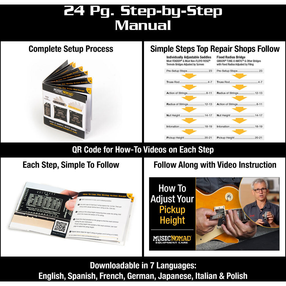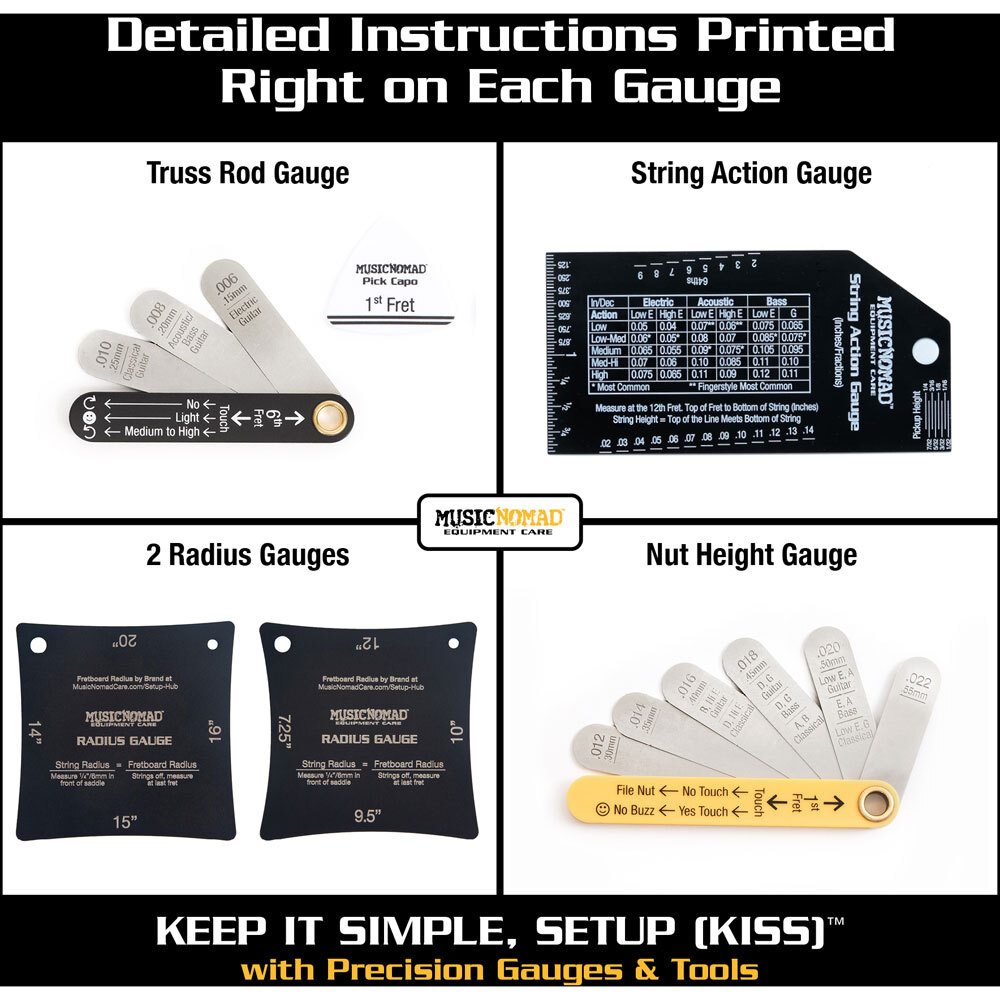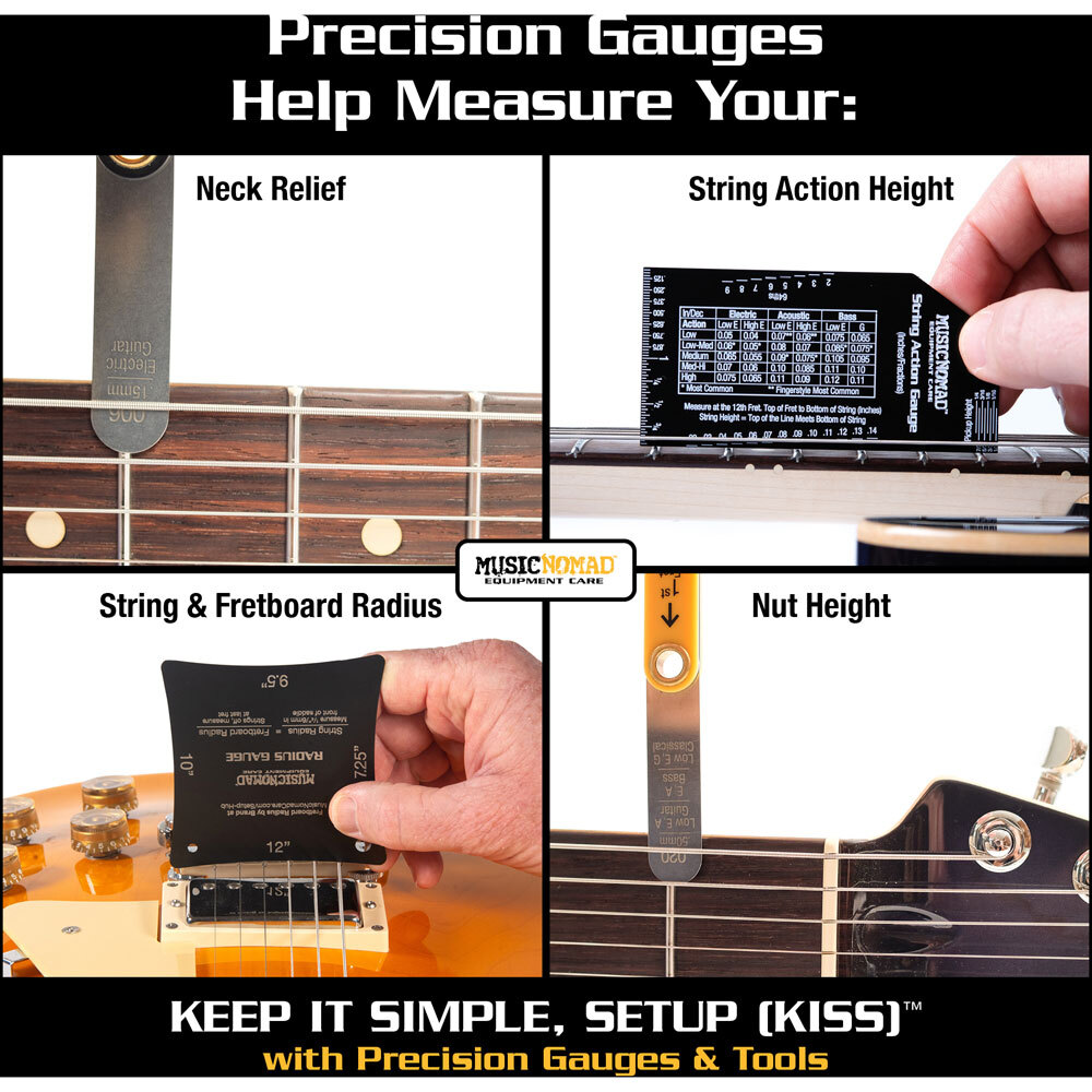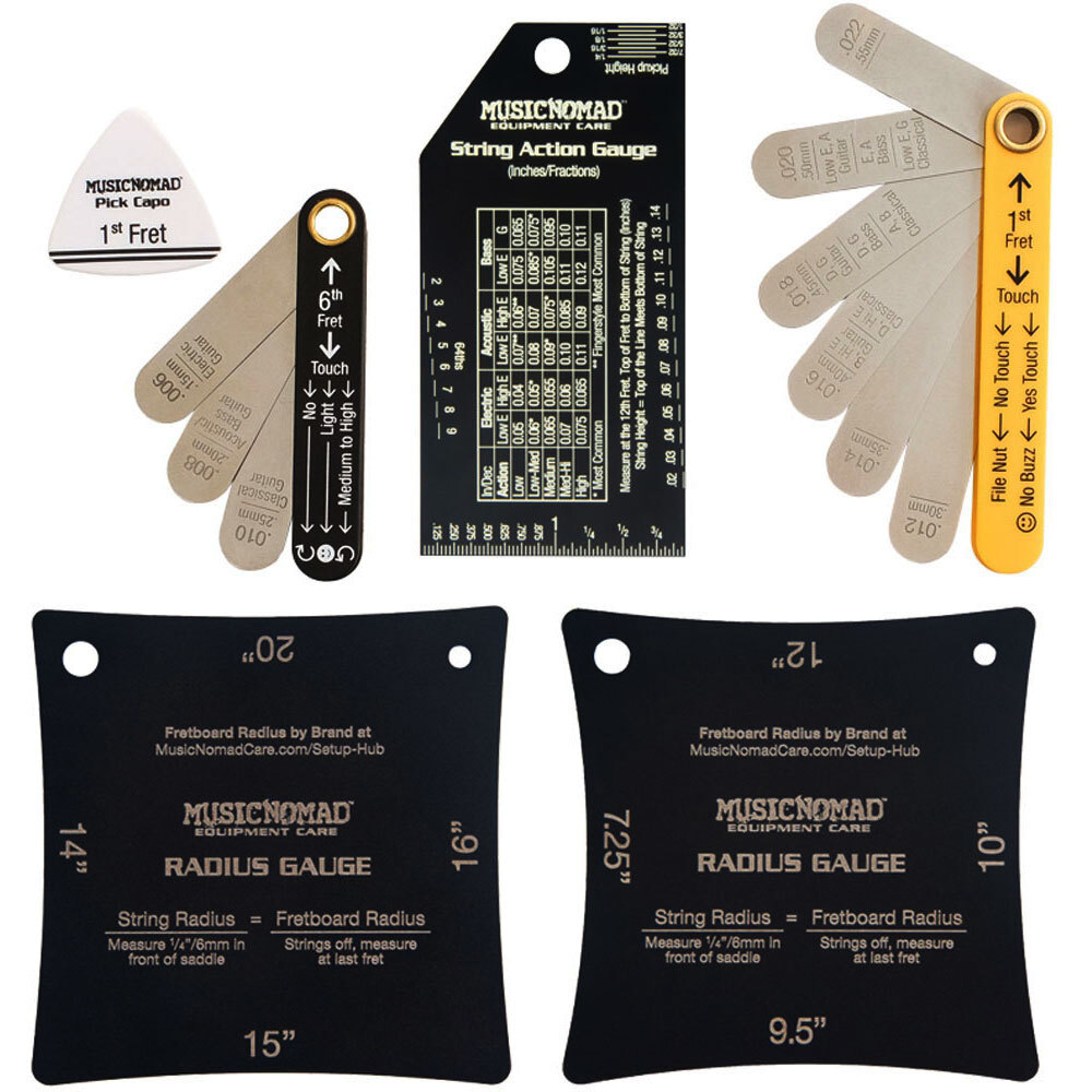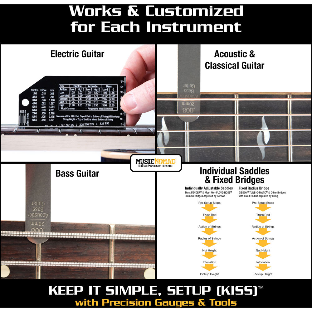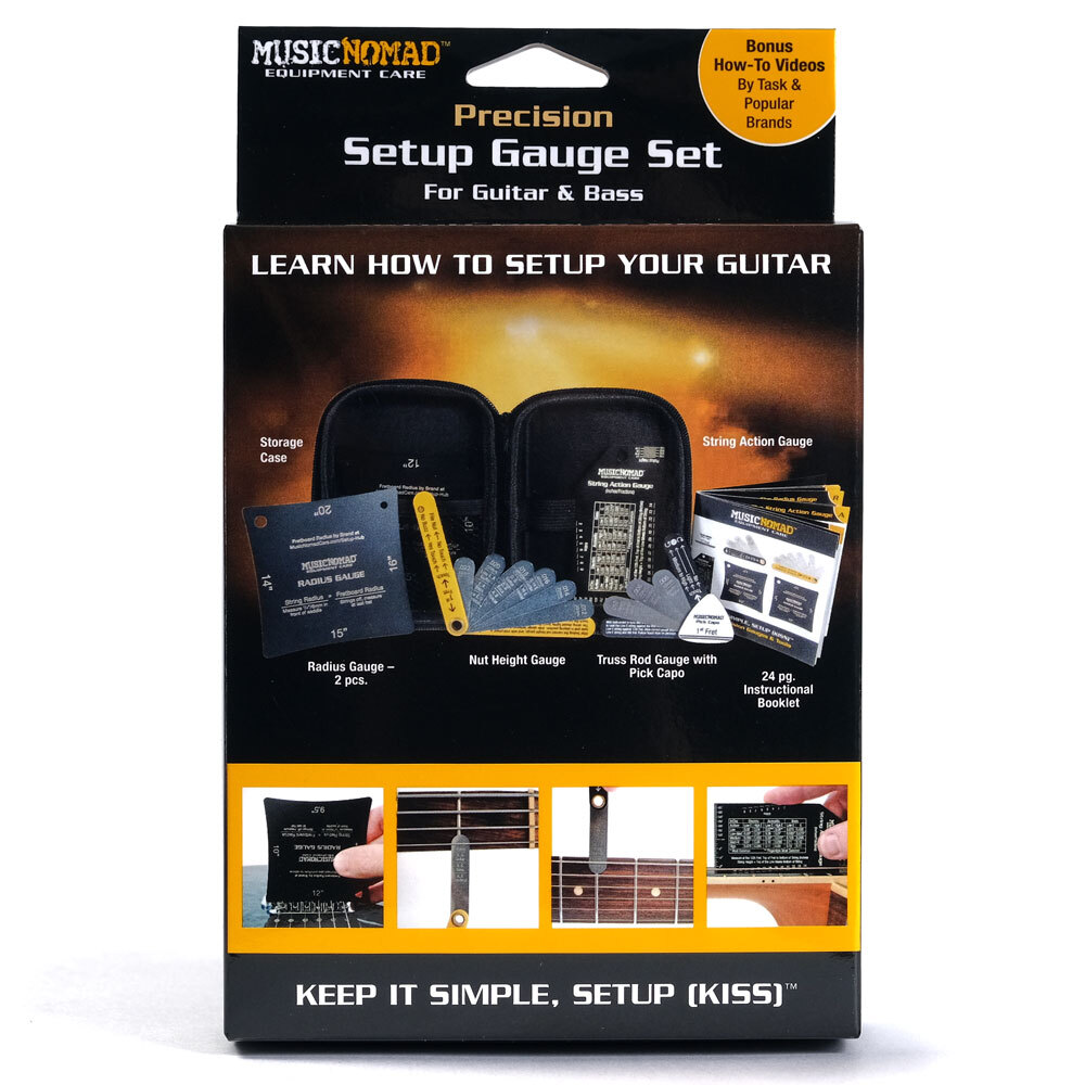Not only is it fun, but a properly setup guitar takes your playing & sound to a whole new level. Music Nomad's 6 pc. Precision Setup Gauge Set demystifies the setup process by developing innovative, high quality gauges combined with step-by-step general guidelines anybody can follow to help setup their guitar or bass.