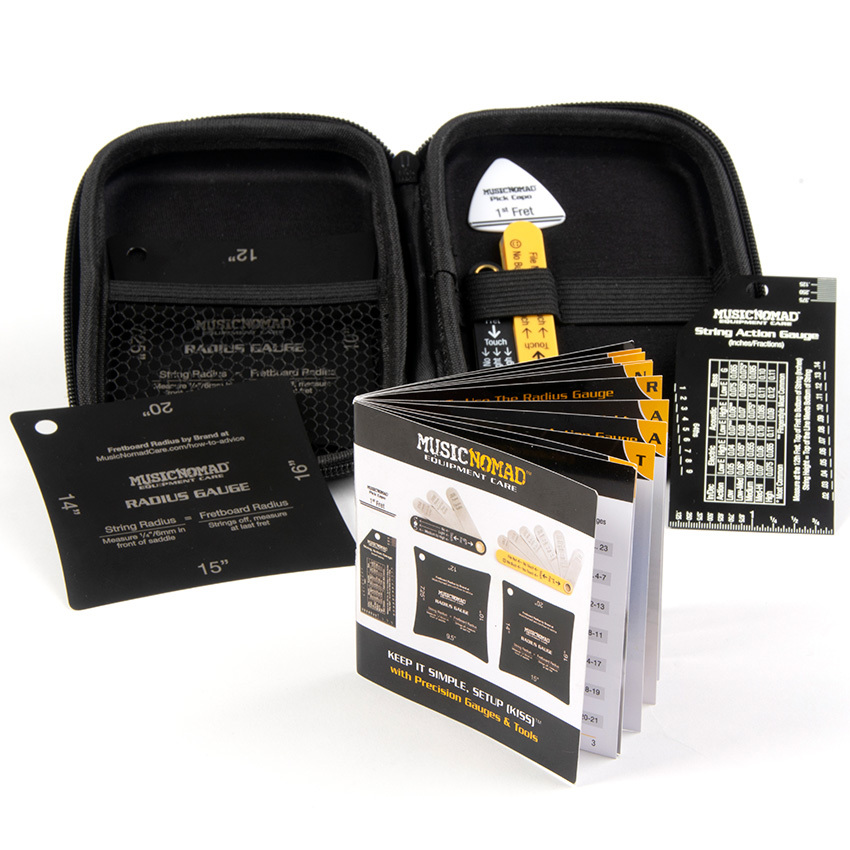The Set includes a: Truss Rod Gauge, Pick Capo, String Action Gauge, 2 Radius Gauges, & Nut Height Gauge. We even include a 24 page instructional booklet & a nice carrying case. That's Music Nomad quality - raising the bar in equipment care.