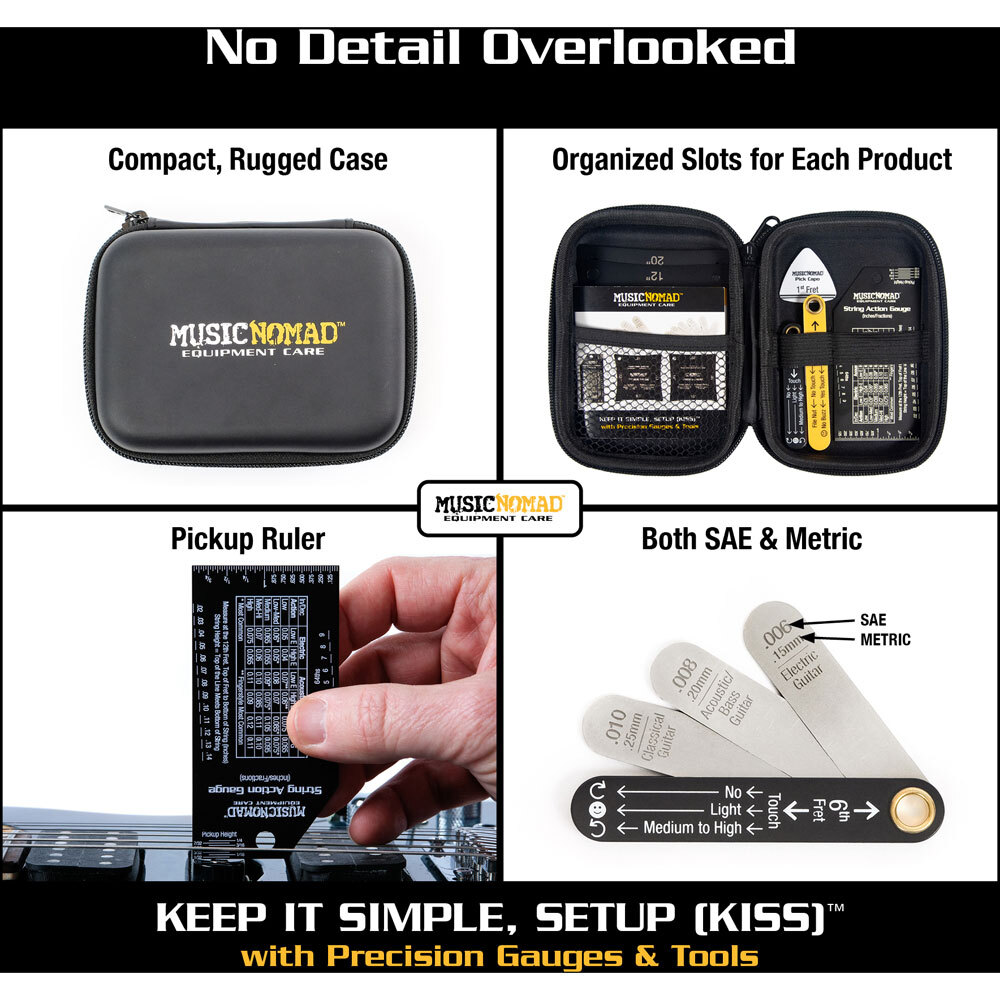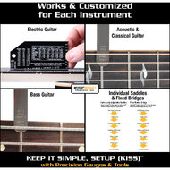 After several years of research & development and in collaboration with Master Guitar Tech Geoff Luttrell & other top repair techs, Music Nomad has developed the KEEP IT SIMPLE, SETUP (KISS). With our KISS method and our 6 pc. Setup Gauge Set you can check the vital areas of your instrument & use our tools (sold separately) to perform your own setup. Whether you have an Electric, Acoustic, Classical, or Bass Guitar, we give you the exact spec you need by instrument type, including instructions printed right on the product taking the guesswork out of each task.