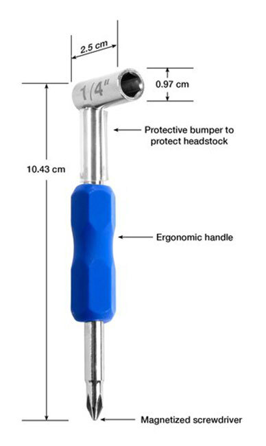 The carbon steel construction gives you the quality you need every time, while the ergonomic handle design provides comfort and ease when using. The protective rubber bumper keeps you from jamming the metal handle into the side of the truss rod opening. We even designed a magnetized screwdriver for the small screws found on the truss rod cover. That's Music Nomad quality raising the bar in equipment care.