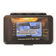Designed to work on most electric, acoustic, and bass guitars this 11-piece set comes with 6 Allen Key sizes, 3 Socket Wrench sizes, a specially designed Spoke Wheel tool and a 3/8" Blade bit. Bonus features include: laser etched sizes on each wrench, 3 magnetized screwdrivers for small truss rod cover screws and the Socket Wrenches and Spoke Wheel tool slide into Music Nomad's Octopus handle (sold separately) for additional leverage and comfort.