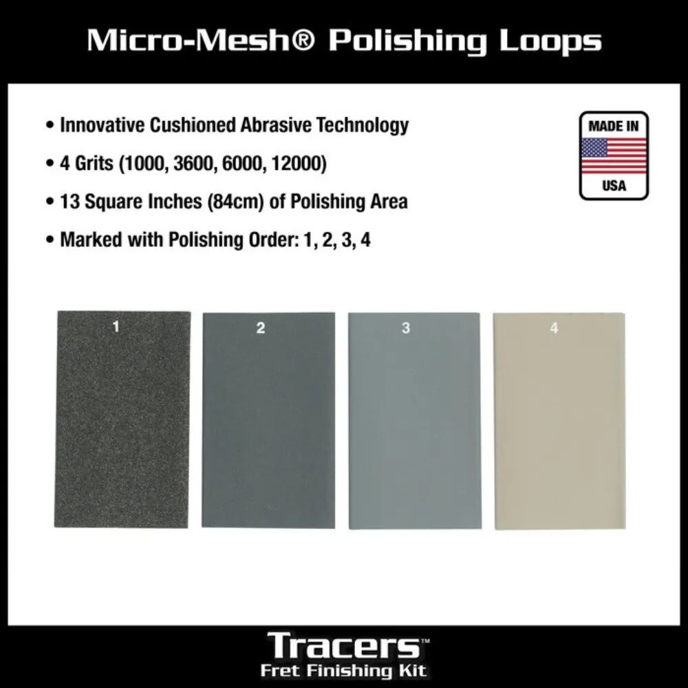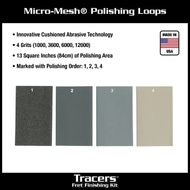 - Our custom designed Micro-Mesh® loops are like no other. With 13 square inches (84cm) of polishing area, they are designed to slide on to both Tracer handles and give you a great polishing experience compared to fumbling around with traditional sheets of polishing paper. Micro-Mesh® utilizes an innovative “cushioned” abrasive technology that delivers uniform, floating abrasive crystals bonded to a flexible, resilient cloth backing, giving superior results. They come in 4 Micro-Mesh® grits (1000, 3600, 6000, 12000) that are marked in the order to polish: 1, 2, 3, 4. It can’t get any better than that.