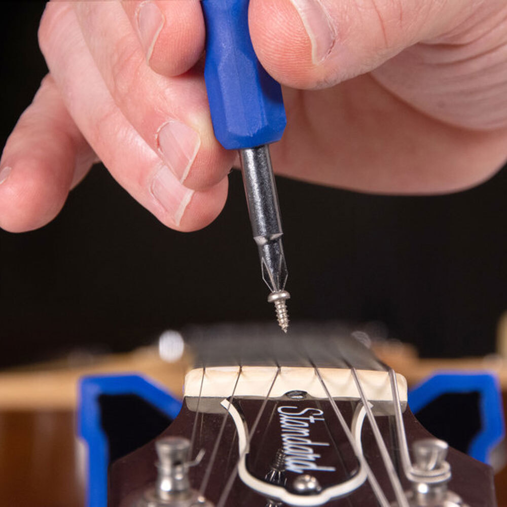 Equipped with a handy magnetic screwdriver on one end remove the tiny truss rod screws, and then turn it around and use the wrench to properly adjust your truss rod. Our ergonomic handle and rubber protective bumper gives you the comfort around your prized instrument.