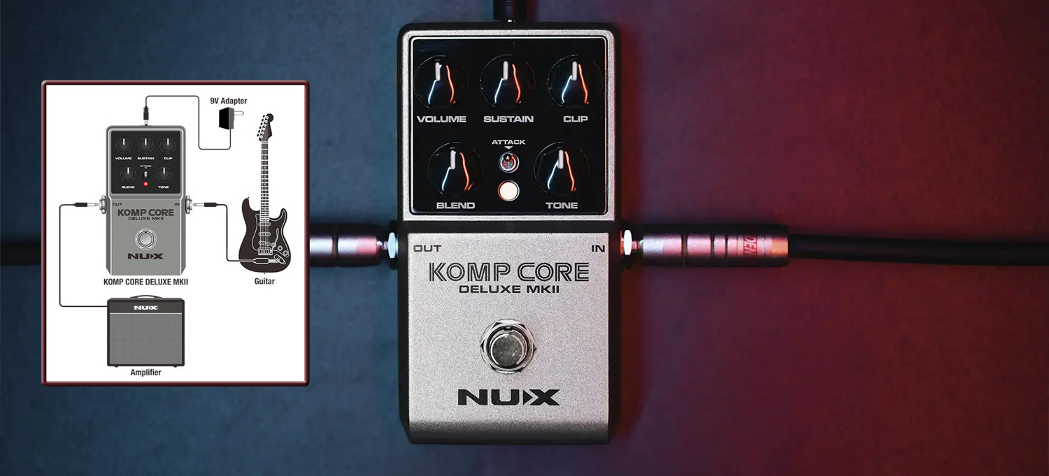 The NU-X Komp Core Deluxe MKII is a premium compressor pedal designed to deliver studio-grade compression in a compact stompbox format.