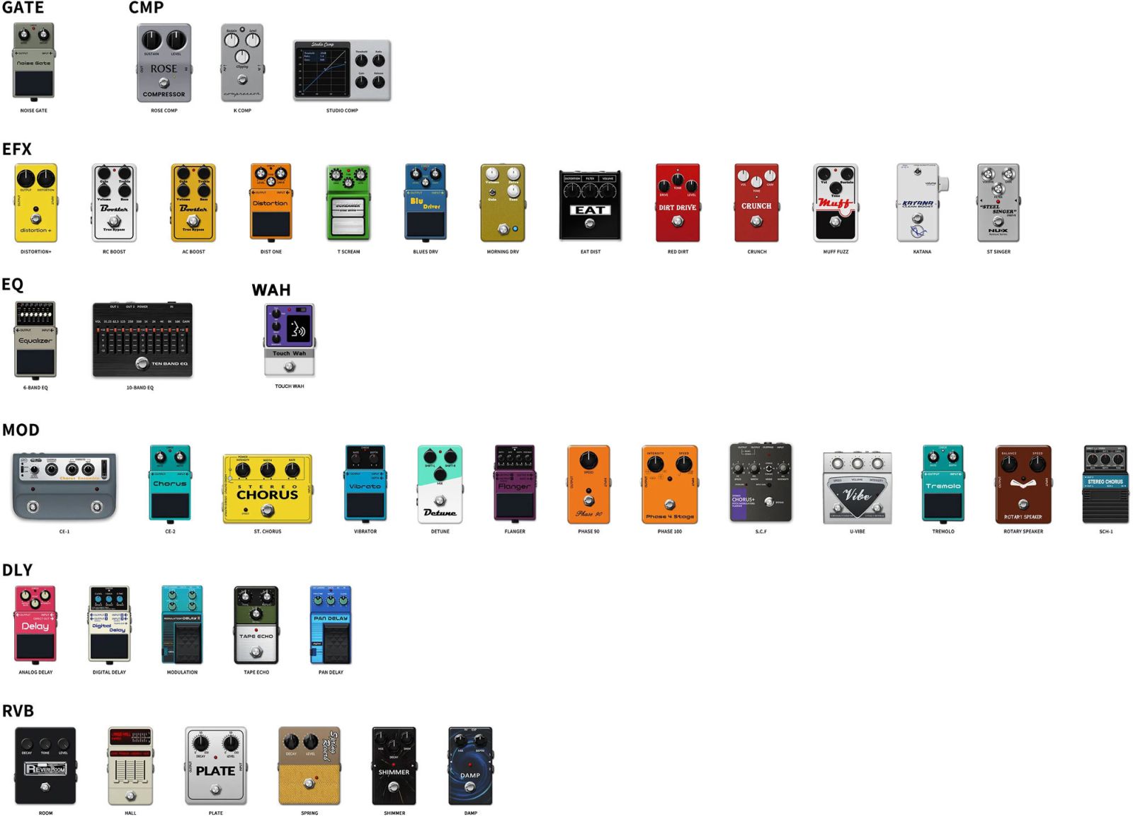 - Iconic Effects: Equipped with overdrives, delays, compressors, reverbs, and EQ settings to cover all essential sound shaping needs.