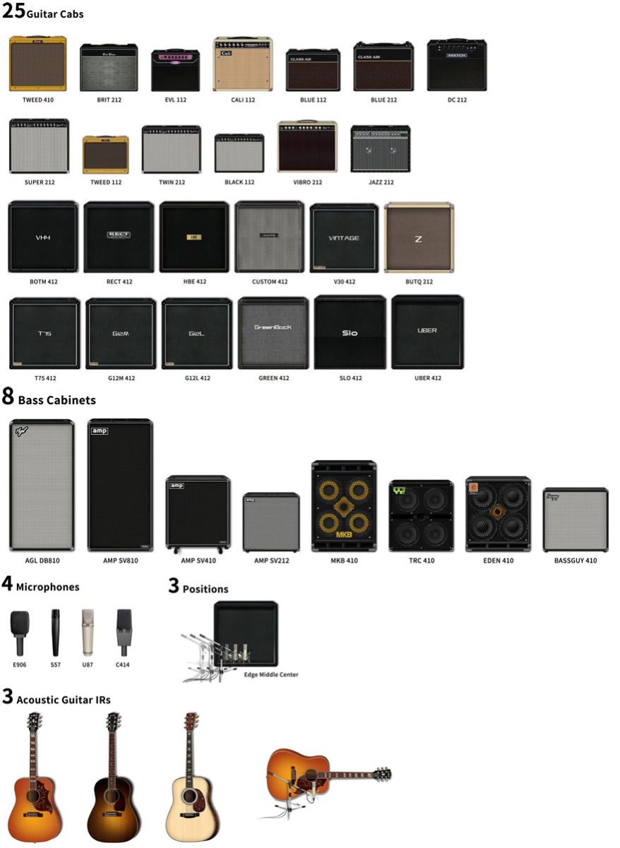 - Impulse Responses: Includes 25 guitar cabs, 8 bass cabs, 3 acoustic IRs, 4 microphones, 3 mic positions, and 24 user-loadable IR slots.