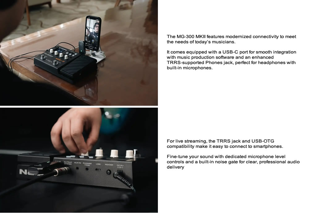 The MG-300 MKII also upgrades the expression pedal switch. Compared to the previous version, it now features a physical Toe Switch, offering more convenience and a clear 'switching feel'. And there's no need for 'expression pedal calibration' anymore. The Expression Pedal can be used to control the volume or the effects.