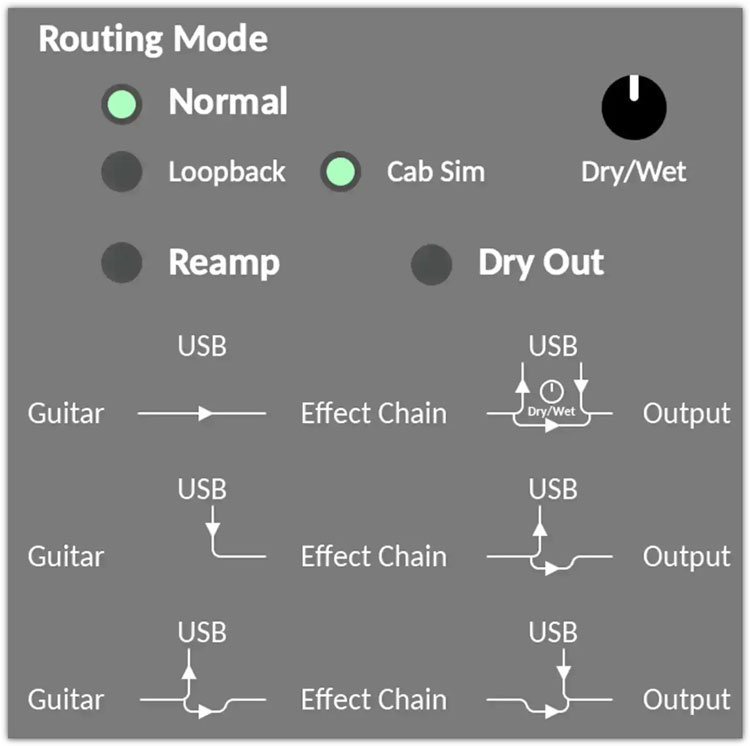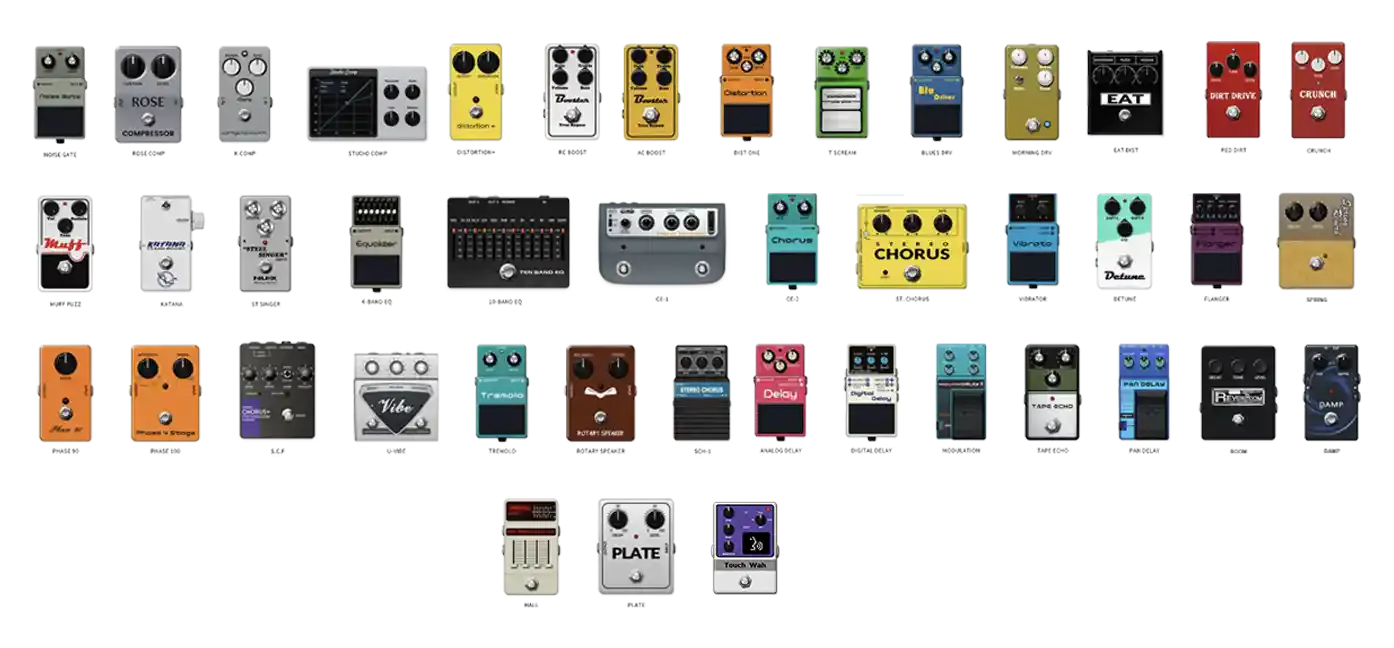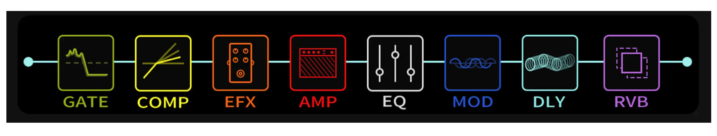 - GATE, COMP, EFX, AMP EQ, MOD, DLY, RVB effect blocks with free, fully routable order.