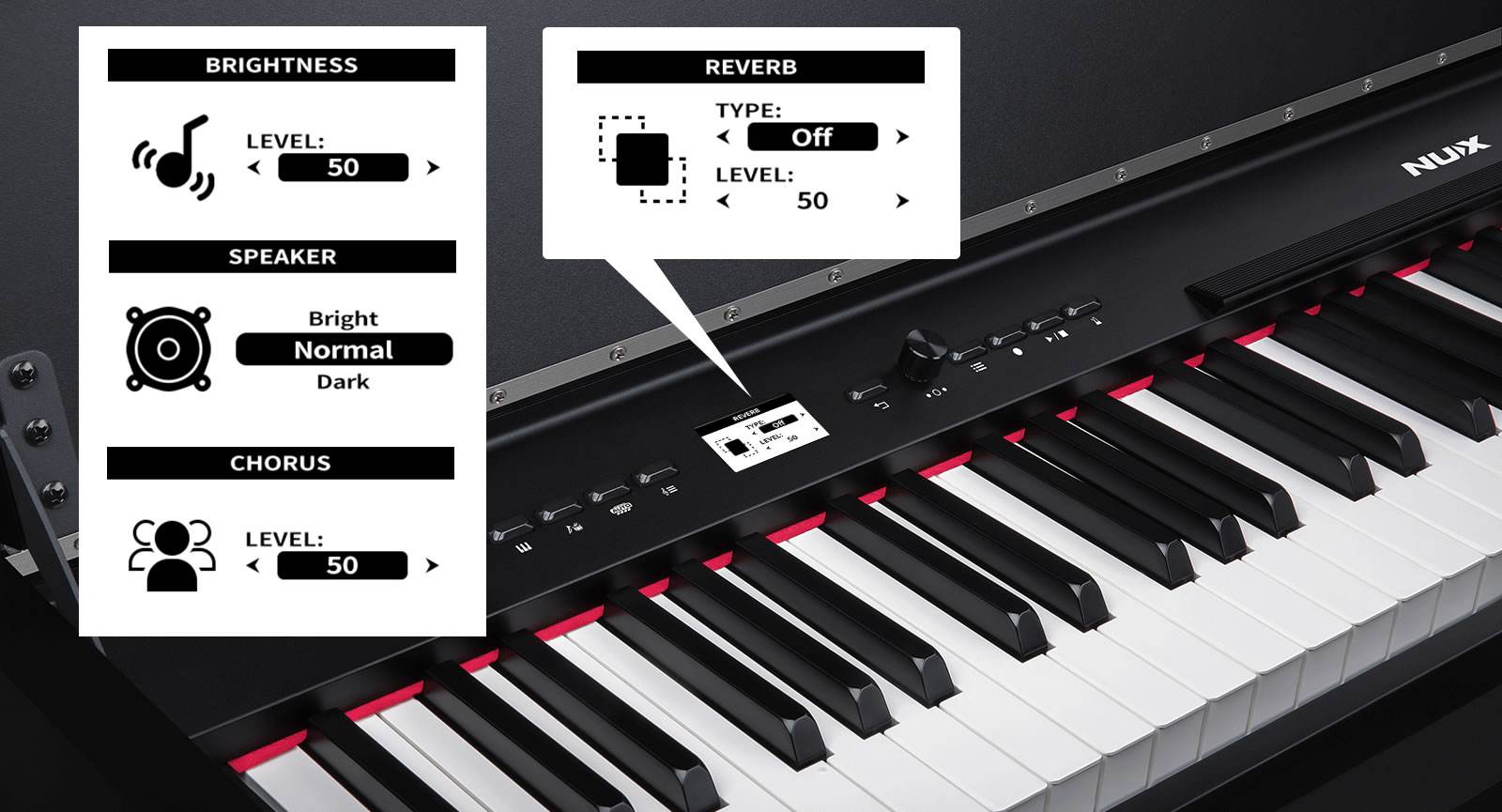 The NCK-330 is equipped with NUX WKJ-03 Triple-Sensor Scaled Hummer-Action Weighted Keyboard with escapement and synthetic ivory/ ebony keytops. The touch response curves has been refined. You can select the ideal touch response to match your playing style, making your performance more expressive.