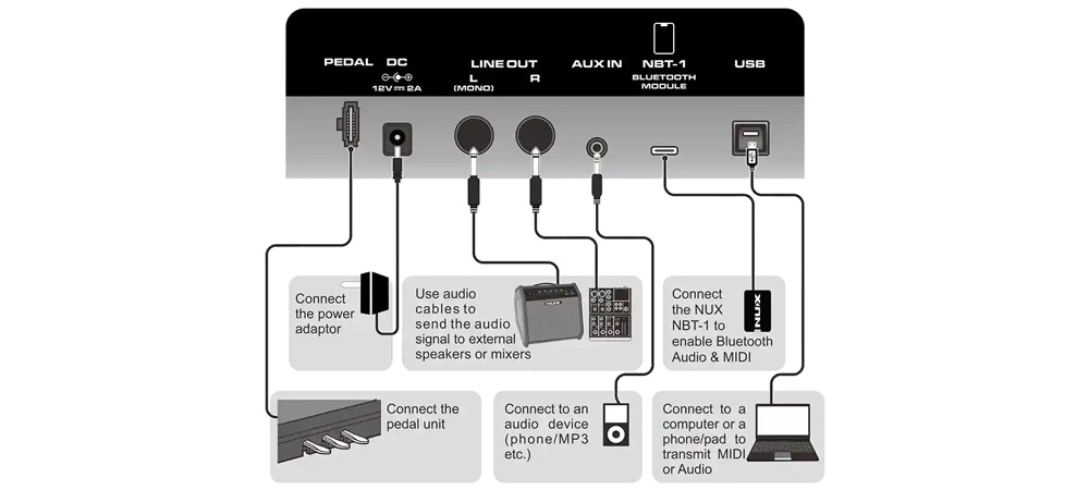 - Connectivity: 3.5mm Stereo Phones Out, 6.35mm Stereo Phones Out, 6.35mm Line Out (L/MONO, R), 3.5mm Stereo Aux In, Pedal Jack, NBT-1 Bluetooth Module Jack, USB Jack, DC 12V 2A Jack