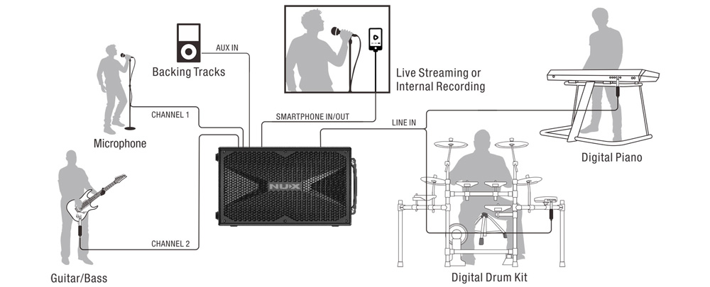 AC power cable x1, 1/8″ TRRS audio cable x1, NBT-1 Bluetooth module x1, Owner’s manual x1, NUX sticker x1