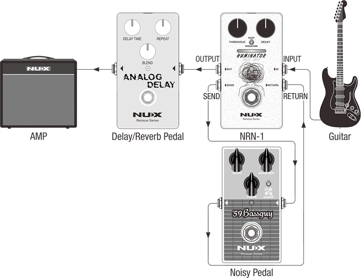 Connect the noisy pedal in the SEND/RETURN loop, the HUMINATOR will sense your guitar signal and allow the suppression circuit to activate only as your guitar signal dies out, making the sound more natural.