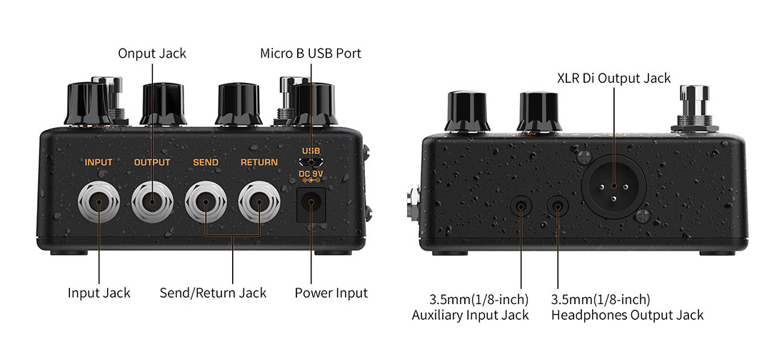 - Micro B USB Port: You can connect the pedal to your computer to use the Optima Air software to create, edit and save your presets. And update the pedal when a new firmware released.