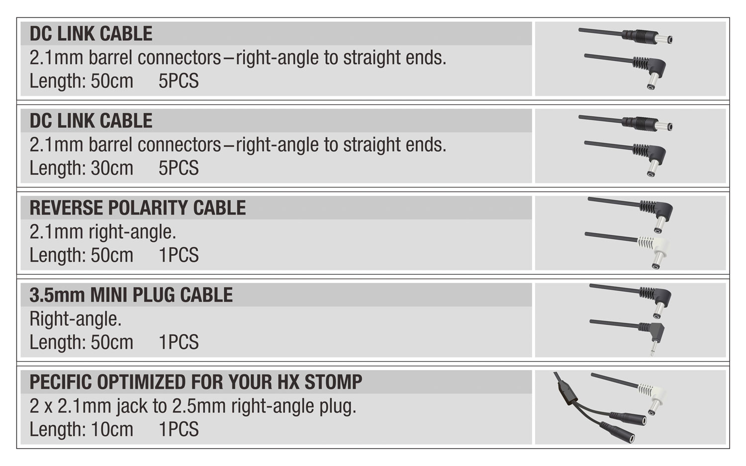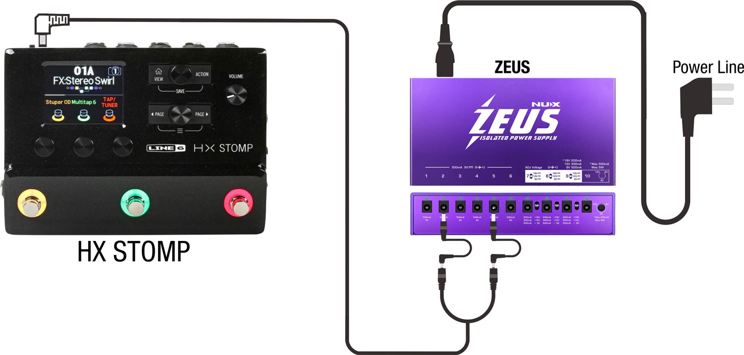 Besides regular DC cables, reverse polarity cable, 3.5mm mini plug cable, Zeus offers HX current doubler adaptor. Zeus can even drive LINE6 HX-STOMP with no doubt.
