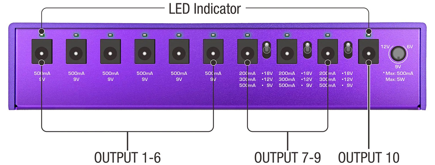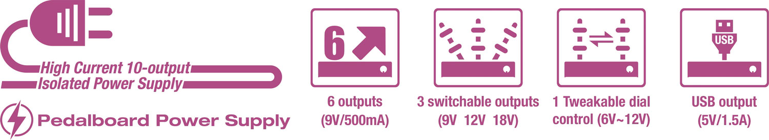 Zeus provides 10 high current isolated DC power. It equips 10 isolated switching power transformers to offer a clean and stable source for your pedals. As a modern musician, guitarists like digital post effects like Eventide, Strymon, "¦etc. So Zeus comes with 3 adjustable high current outputs (9v/500ma | 12v/300ma | 18v/200ma), and 1 tweakable high current output (6v~9v~12v). It means you can use Fuzz or Phaser with the tweakable output to find the best sound.