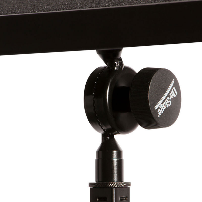Complete with Posi-lok pivot mechanism for precise angle adjustment, the black powder coat-finished KSA8585 rises 10" (from single tier stands) and includes a hook and loop for safe, secure gear-fastening.