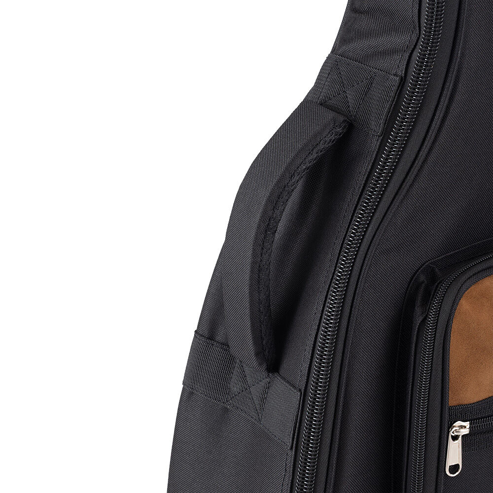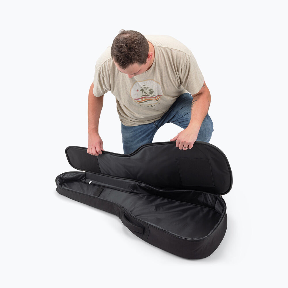Three outer accessory compartments with zipper closures conveniently keep picks, capos, tuners, strings, and other tools and supplies organized and with the guitar. Two adjustable straps enable ergonomic backpack-style transportation while the padded top handle makes it easy to comfortably lift and carry like a traditional hardshell case. And the two-pull zipper keeps the instrument securely contained and opens and closes at either end or any point in between for efficient loading and unloading.