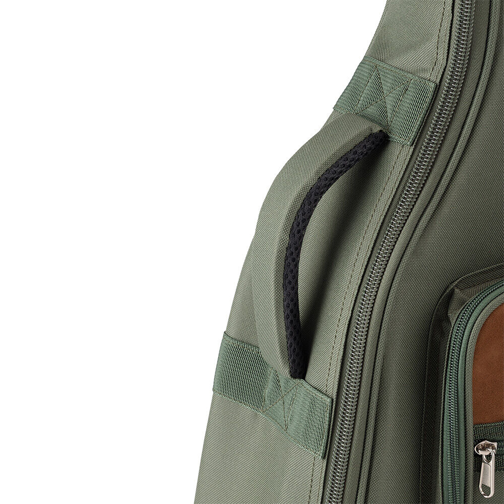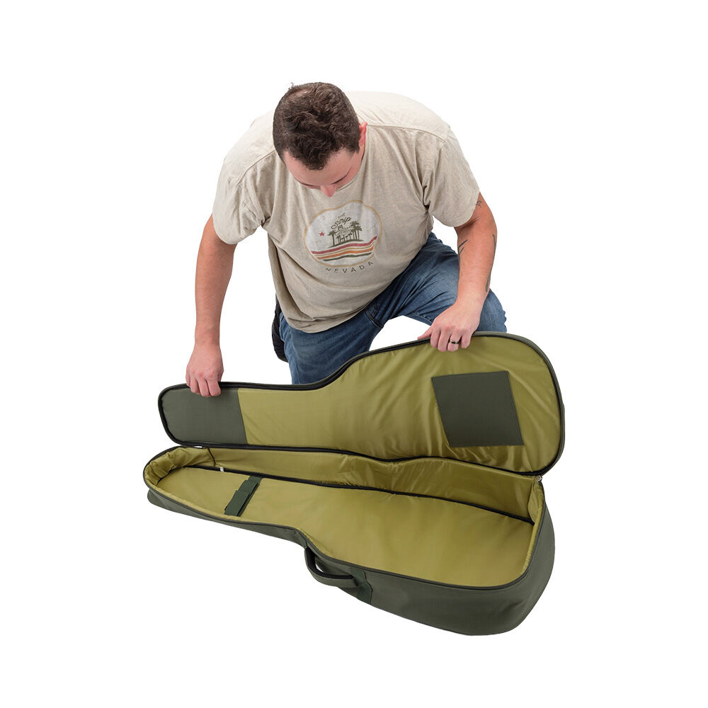 Three outer accessory compartments with zipper closures conveniently keep picks, capos, tuners, strings, and other tools and supplies organized and with the guitar. Two adjustable straps enable ergonomic backpack-style transportation while the padded top handle makes it easy to comfortably lift and carry like a traditional hardshell case. And the two-pull zipper keeps the instrument securely contained and opens and closes at either end or any point in between for efficient loading and unloading.
