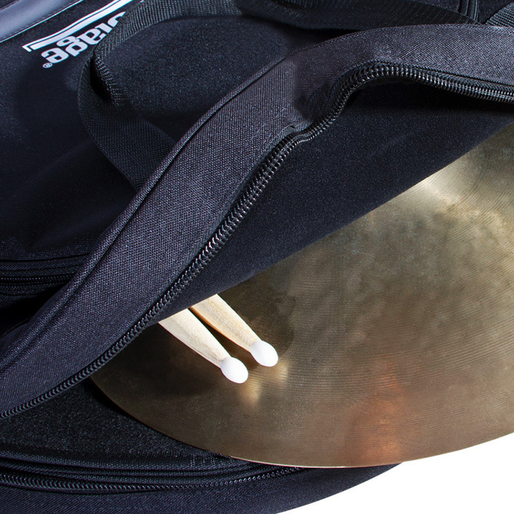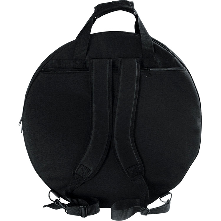 Four 22" cymbals fit inside the bag's primary compartment, while the smaller exterior compartment accommodates hi-hats and cymbals up to 15". The bag includes felt separators to prevent cymbals from damaging each other. Adjustable backpack straps enable hands-free transportation and tuck inside the rear accessories pocket when not in use, while the double handle with velcro closure offers a comfortable carrying alternative.