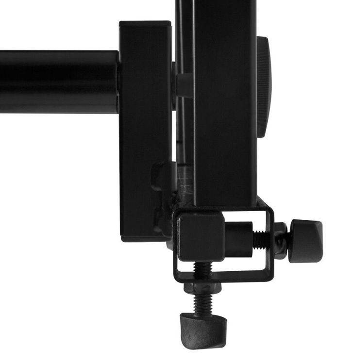 Compatible with any 1" square or 30mm round-tubed stand, as well as On-Stage Z stands, each of the KSA8500's support arms feature an independent 10-degree increment posi-lok adjustment for height, angle, depth and width, providing 43.5" of total width distributed over a 2nd or 2nd and 3rd tier configuration.