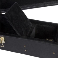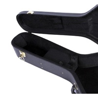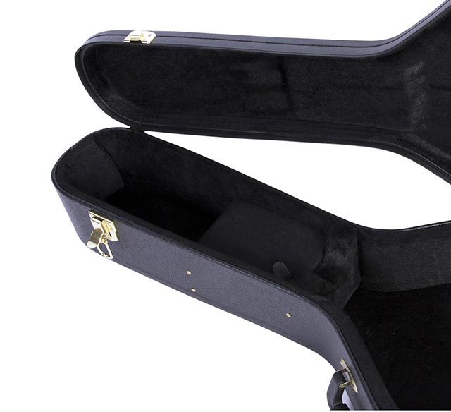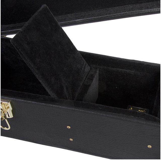 Along with a weather-resistant skin that defends against the elements, the case features a rigid structure that stabilizes and supports the guitar body and neck. The soft plush interior lining safeguards the instrument finish. An accessories compartment provides convenient access to supplies and tools. Sturdy metal latches ensure that the lid stays closed and, to prevent tampering, one latch includes a built-in lock. All hardware is gold-plated to resist corrosion. The centered top handle enables balanced, comfortable carrying.
