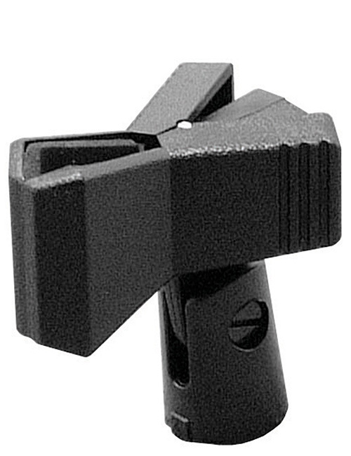 On Stage microphone holder with spring-loaded clip. 5/8"- 27" female threaded insert in plastic base.