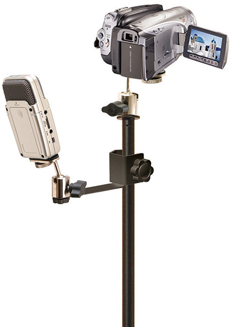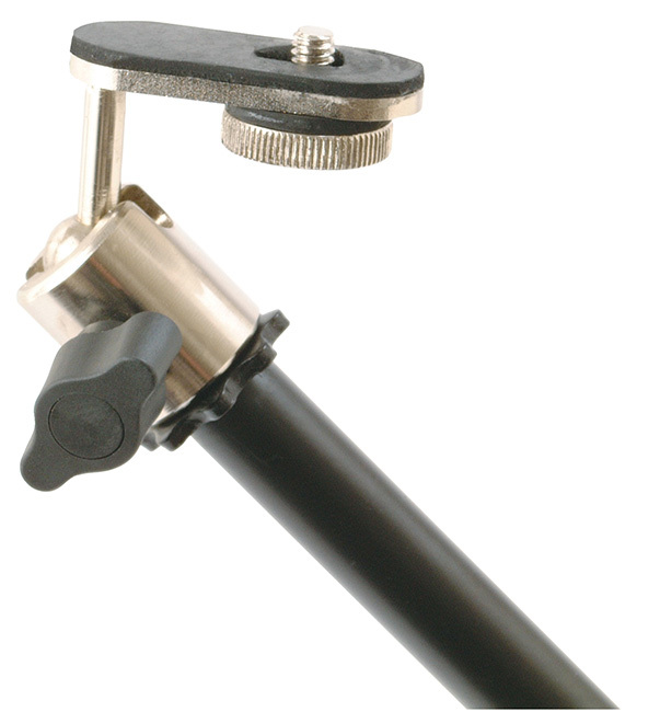 Attach this innovative adapter to any 5/8" - 27" threaded mic stand/boom to support a video camera or digital recorder with standard 1/4" threaded female inserts.