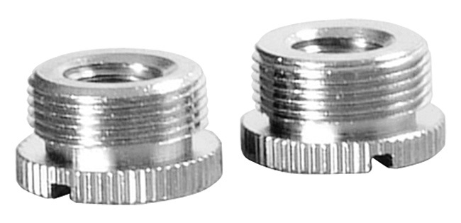 5/8" male to 3/8" female adaptor for use with mic stands with European 3/8" threads. Knurled outer flange for ease of tightening.