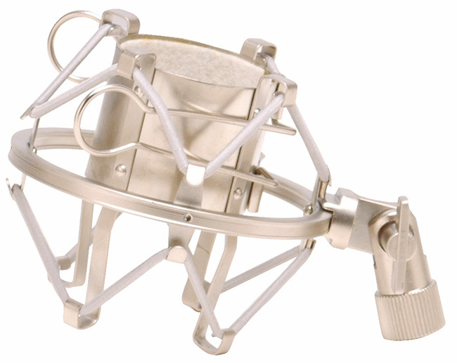 The diecast steel adapter with 5/8" - 27" threads features an angle adjustment with locking knob and will attach to any mic boom. Clamp interior is lined with cloth to protect your mic.