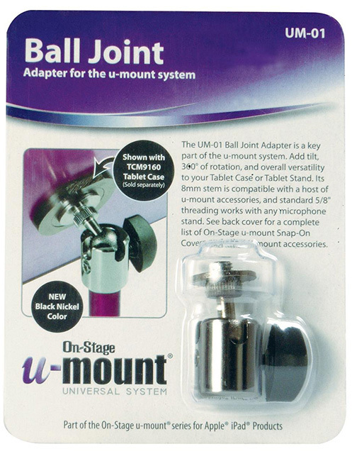 The OSUM01 Ball Joint Adapter allows you to mount the u-mount Tablet Case to the OSTS9900 Travel Ease tripod stand, the OSTS9901 Heavy Duty tripod stand, or any microphone stand with standard 5/8" - 27" threading.