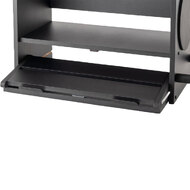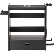 The pedalboard at the bottom holds several guitar-effect pedals and, at 8 inches wide, accommodates a variety of stompbox sizes. An opening down the center of the board makes it easy to route your wires and cables for a clean and practical layout. Hook-and-loop strips are included for securing your devices to the shelves, a popular attachment method that enables ease of rearrangement if you decide to make changes to your setup. When it's time to play, the pedalboard completely slides out of the workstation and can be positioned as close to or as far away from your amp as you choose. When you're finished playing you can slide the board back into the workstation and close the bottom door to shield your pedals from dust, debris, and mishaps.