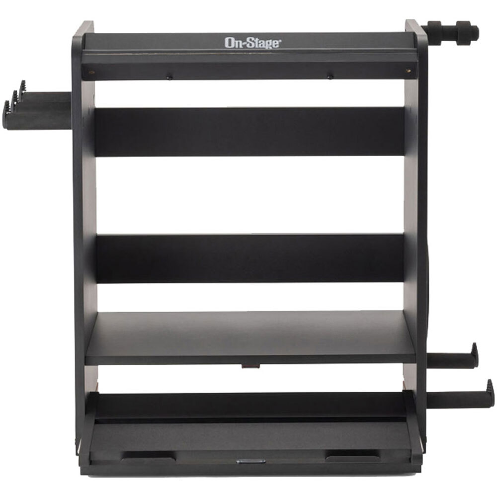 Keep all your guitar gear safely organized, on display, and ready to play with the GWS5000B Guitar Workstation. This multipurpose workstation is a combination amp stand, guitar stand, cable and strap hanger, pedalboard, and accessory tray rolled into one convenient and visually appealing package.