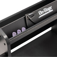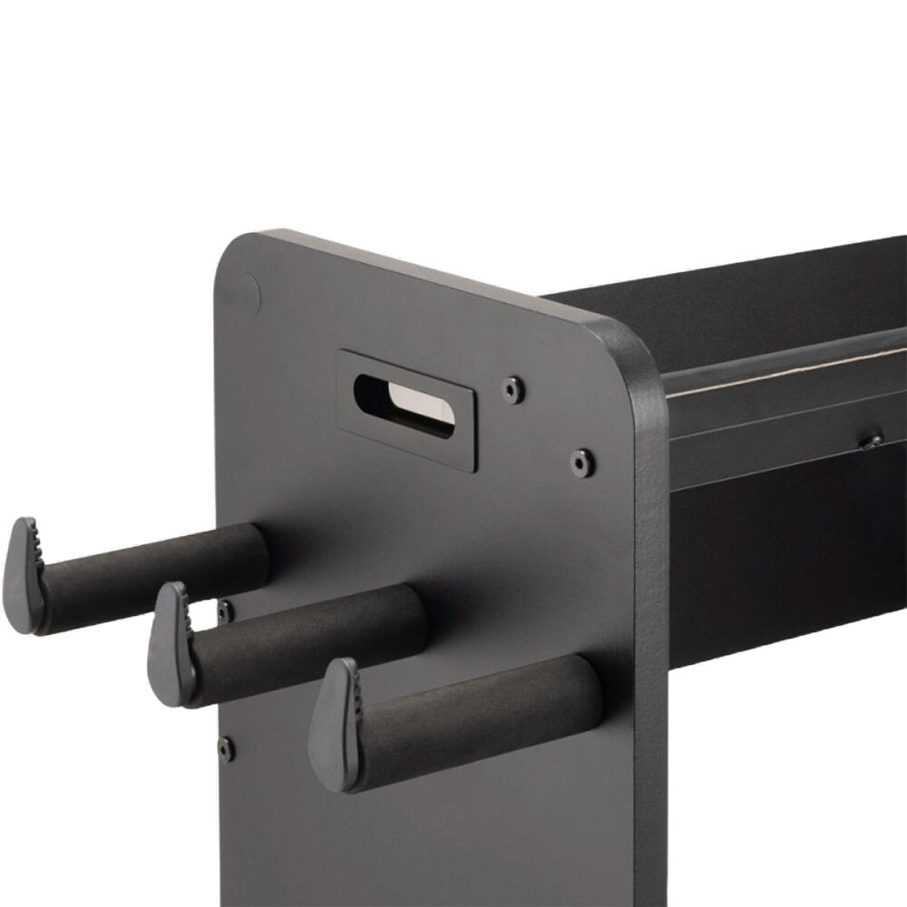 On the right side of the workstation, there's a guitar stand that holds a wide range of popular electric guitars and basses. Padding on the stand's bumpers provides traction to keep your instrument in place and also protects its finish from dings and scratches. Padded hangers on the left side provide storage for long supplies such as coiled cables and guitar straps. Your picks, capos, tuners, slides, and other accessories can be stored on the top shelf for easy access. The shelf is angled back and features a front bumper to keep small objects from falling or rolling away. It's even a good place to prop up your phone for watching lessons, recording videos, or reading music.