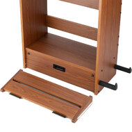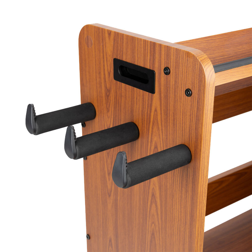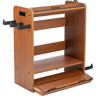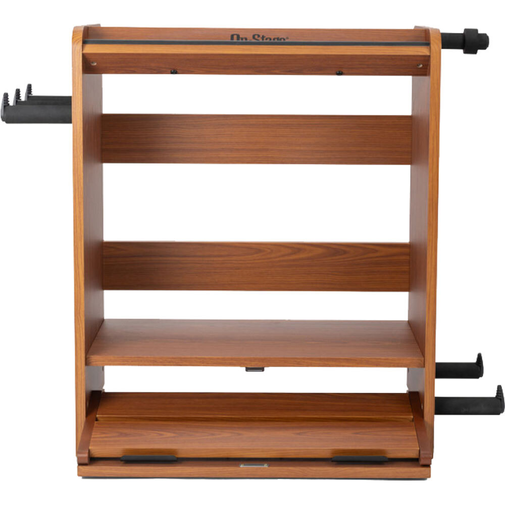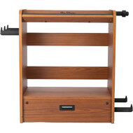 On the right side of the workstation, there's a guitar stand that holds a wide range of popular electric guitars and basses. Padding on the stand's bumpers provides traction to keep your instrument in place and also protects its finish from dings and scratches. Padded hangers on the left side provide storage for long supplies such as coiled cables and guitar straps. Your picks, capos, tuners, slides, and other accessories can be stored on the top shelf for easy access. The shelf is angled back and features a front bumper to keep small objects from falling or rolling away. It's even a good place to prop up your phone for watching lessons, recording videos, or reading music.